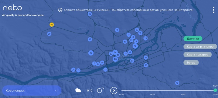 Так выглядит карта на сервисе Nebo.live. Если воздух загрязнён, датчики окрашиваются в оранжевый или красный цвета