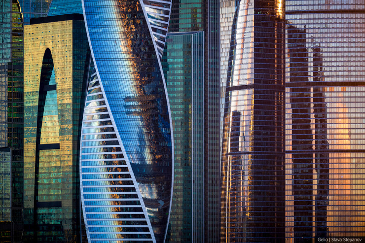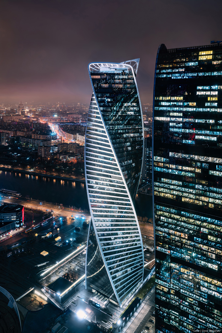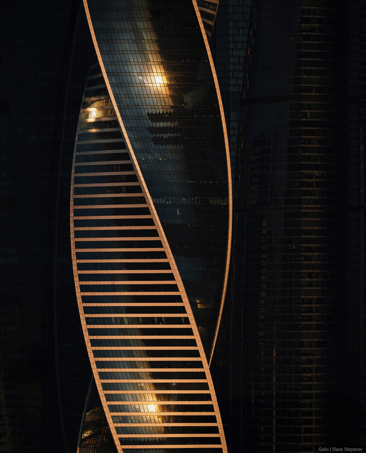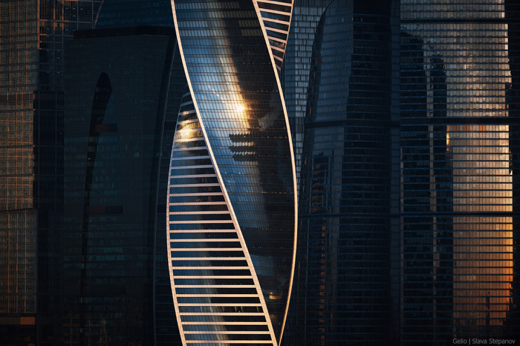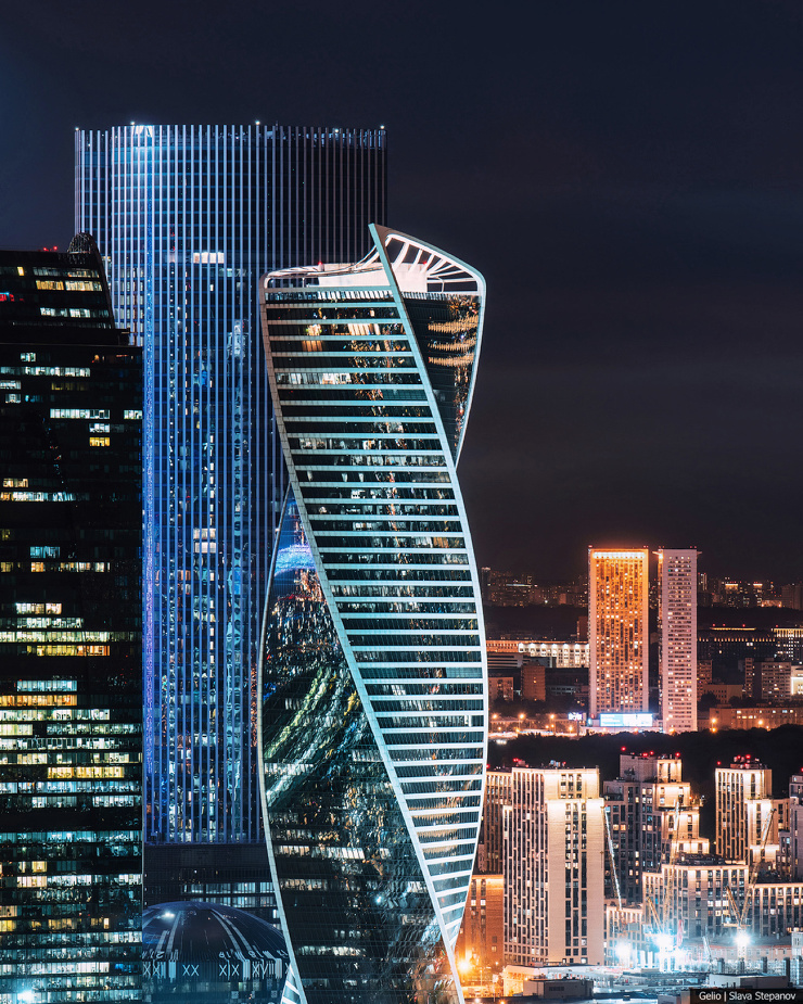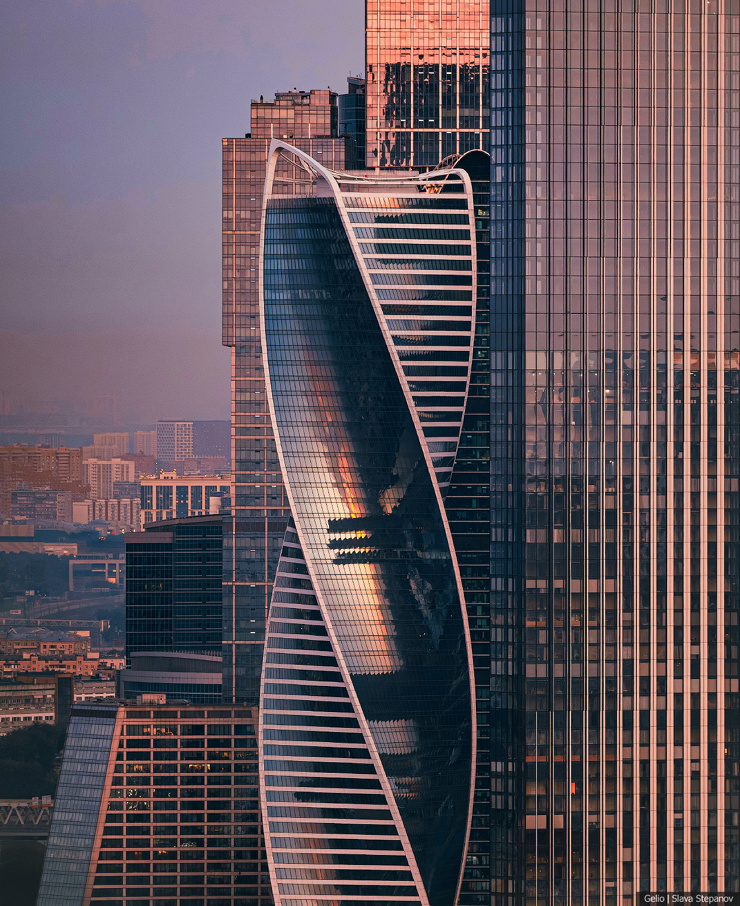 Две ленты противоположных фасадов башни «Эволюция» закручиваются и плавно объединяются металлической конструкцией на кровле. Это напоминает молекулу ДНК и символизирует эволюционную спираль. В здании 55 этажей, общая высота — 246 метров. Небоскрёб расположен в деловом центре «Москва-Сити» и занимает 15 место в списке самых высоких зданий России.