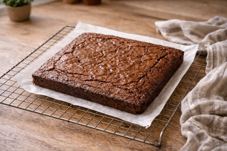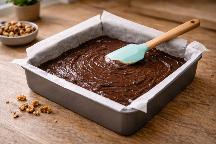 Поставьте форму в разогретую до 170°C духовку и выпекайте примерно 25 минут. Готовность брауни выглядит так: сверху тонкая корочка с трещинками, середина ещё остаётся влажной, именно это и даёт правильную текстуру.