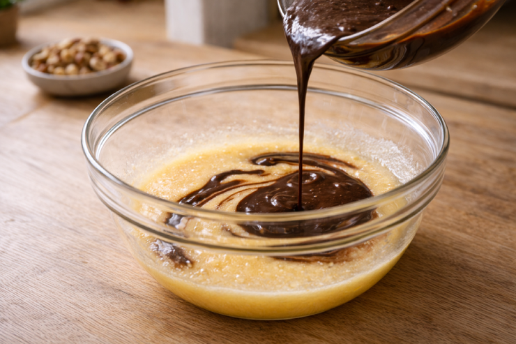 Влейте слегка остывший шоколад с маслом в яичную смесь, перемешайте до полной однородности. Если добавляете ванильный сахар, сделайте это на этом этапе. Затем всыпьте орехи и ещё раз перемешайте.
