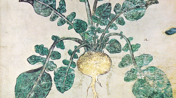 Пока умы наших соотечественников не захватил картофель, роль главного овоща — крахмалистого источника углеводов, который запасали на зиму, — играла репа. В сыром виде у нее довольно резкий вкус, но длительное томление смягчает его и делает немного сладким. Репа долго хранится, хорошо переносит долгую зиму и почти идеально подходит к главной кухонной технологии того времени — русской печи. То, что это не просто героиня сказок, а реальный повседневный продукт, видно по позднесредневековым хозяйственным документам: в новгородских писцовых книгах репа упоминается в числе огородных поставок — наряду с капустой.