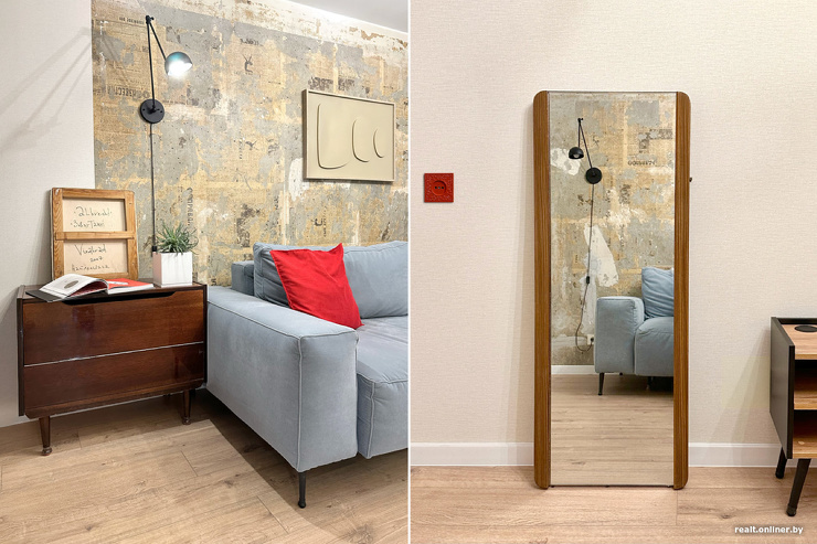 На фоне газетной стены поставили современный диван приглушенного голубого оттенка. Он стал центром притяжения квартиры, а поворотные бра позволили создать более камерный сценарий освещения.