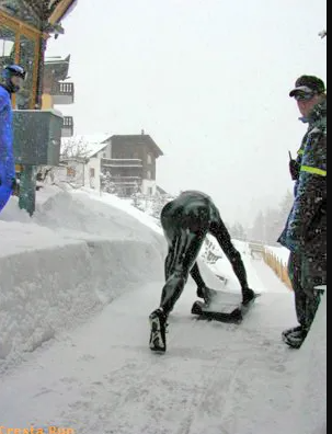 Пикантная деталь в том, что спортсмен скользит буквально на лице — оно находится всего в нескольких сантиметрах надо льдом — на скоростях до 130 км/ч. Только закрывающий всю голову шлем спасает его от травм, если он коснется подбородком трассы.