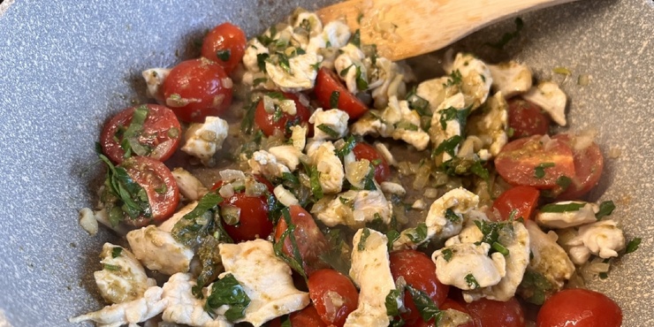 Ужин за 20 минут: спагетти с курицей, черри и соусом песто (12 фото)