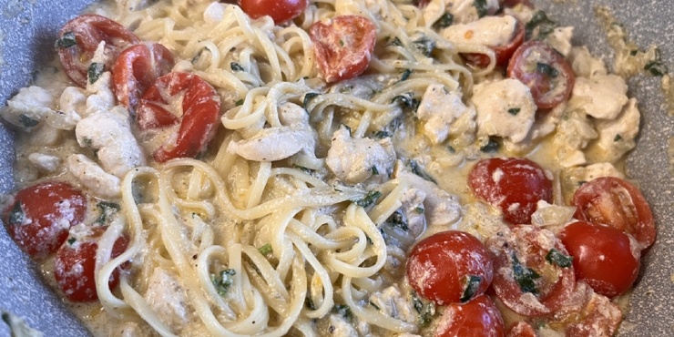 Смело заявляю, что блюдо на скорую руку вполне себе тянет на ресторанную пасту. Сливочный соус в спагетти выгодно оттеняют нотки базилика из песто. Помидоры черри придают приятную кислинку, а тонкие слайсы куриного филе остаются нежными и мягкими. Такое сочетание сделает ужин изысканным, а его приготовление не займёт много времени и сил.