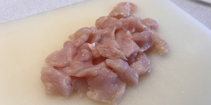 Нарежьте куриное филе тонкими слайсами.