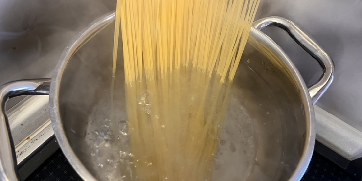 Наполните кастрюлю водой, слегка подсолите и поставьте на плиту. После закипания всыпьте спагетти и варите по инструкции на упаковке. Моим требуется 6–8 минут.