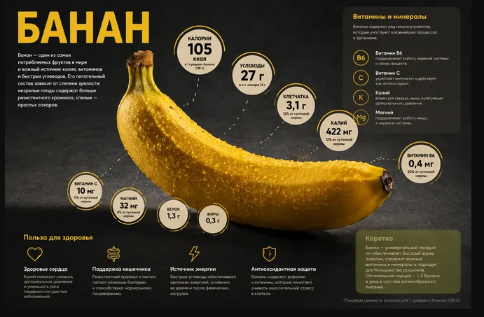 Важно отметить главную особенность бананов: их состав изменяется в зависимости от зрелости. Зеленые бананы содержат больше резистентного крахмала, который ведет себя как клетчатка, а по мере созревания он превращается в простые сахара — глюкозу, фруктозу и сахарозу.