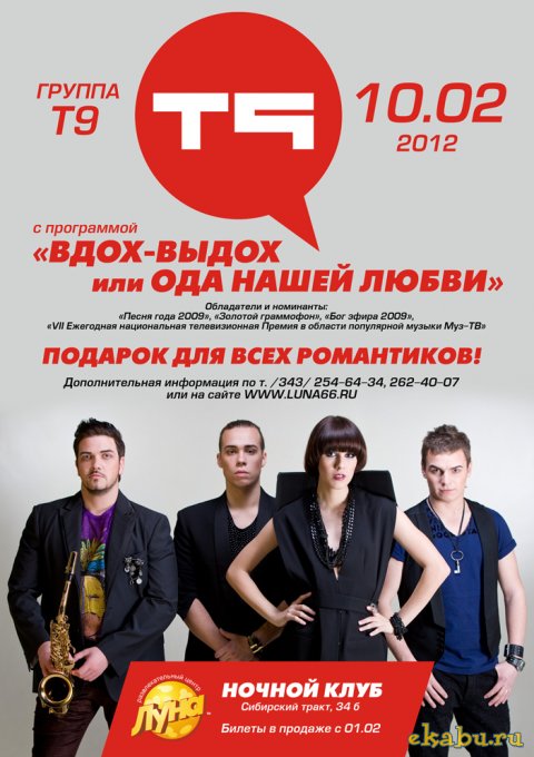 Билеты на единственный концерт группы «Т9» в Ночном клубе «Луна» можно приобрести в кассах РЦ «Луна».