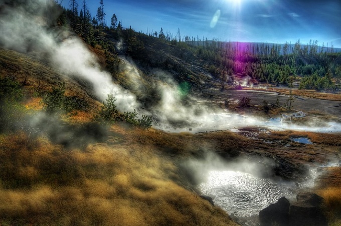 Гидротермальные источники в национальном парке Йеллоустоун. Это самый старый и самый большой из всех национальных парков США: