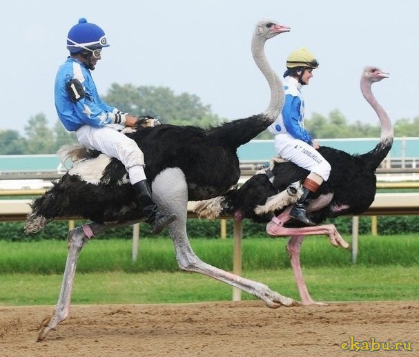 Когда я был с экскурсией на страусиной ферме, гид упоминала, что если очень постараться, то можно оседлать огромную птицу и кататься на ней. Но я даже не мог подумать, что где-то могут действительно проводиться скачки на страусах. Как по мне, это - не самая удачная идея. А запрячь страуса в колесницу - и подавно.