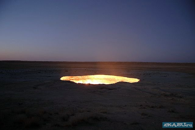 Дарваз - таинственное и странное место в Туркменистане. Представьте, кругом пустыня и вдруг среди песков кратер из которого вырывается пламя. Происхождение этого завораживающего зрелища весьма прозаично: в 1971 году здесь бурили разведочную скважину на газ и наткнулись на подземную каверну. Буровая вышка со всем оборудованием и транспортом провалилась «в тартарары». Люди, слава богу, не пострадали. Из техногенного кратера пошел природный газ. Чтобы не травились люди и скот, газ подожгли. С тех пор, вот уже 35 лет, горят негасимые факелы. Сколько с тех пор сгорело миллионов (миллиардов) кубометров ценнейшего природного сырья, не знает никто. Но зрелище, согласитесь, потрясающее. Не даром путешественники его называют "Дверью в преисподнюю"