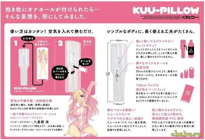Японцы как всегда превзошли сами себя. Очередная подушка в их исполнении превратилась в настоящий шедевр и мечту любого дрочера. Дело в том, что именно эта подушка не только для головы, но и для всего тела. При чём ниодному органу на ней (подушке) не будет скучно, так как даже для НЕГО припасено специальное приятное место ))