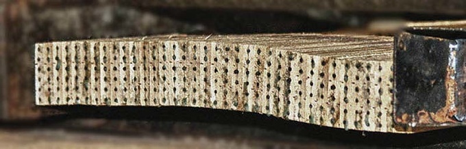 После укладки половинки дощечек склеиваются клеем ПВА, и их оставляют сохнуть под прессом. Суть этой операции в том, что сам стержень не приклеивается к дощечкам. Его диаметр больше, чем диаметр канавки, и для того чтобы конструкция замкнулась – необходим пресс. Стержень же будет держаться в древесине не за счет клея, а за счет натяга деревянной оболочки (специально созданного таким образом преднапряжения в конструкции карандаша).
