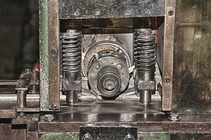 После этого стержни попадают на сборку. Вот на таких станках подготавливаются дощечки для карандашей. В них выпиливаются канавки под установку пишущих стержней.