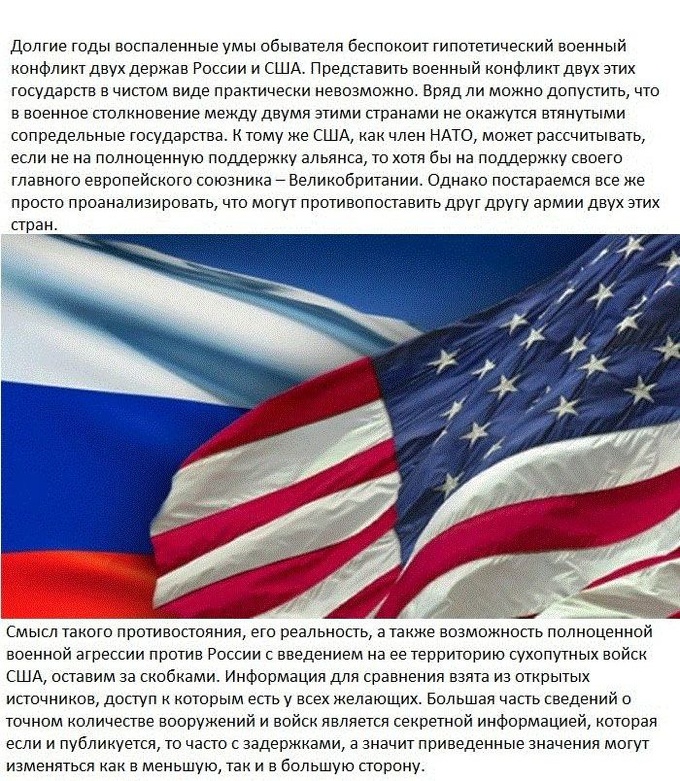 Предлагаю вашему вниманию очень интересный и детальный обзор боевой мощи двух сверхдержав: России и США. Далее вы узнаете, какая тяжелая техника числится на защите этих двух государств, и сможете сравнить суммарное вооружение этих двух стран.