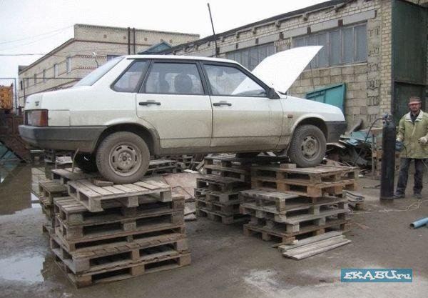 Машину на вилы погрузчика нужно брать на два перевёрнутых друг к другу поддона, чтоб под машину подходил поддон нижней частью, дабы не помять глушак.