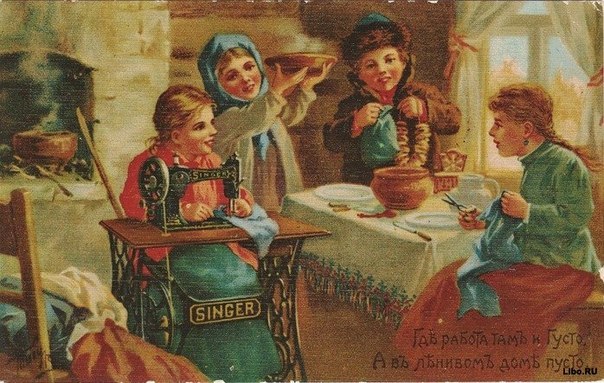 В начале XX века компания «Зингер» выпустила большую серию рекламных открыток с русскими пословицами и поговорками. Этим она деликатно напоминала о себе, расположив товарный знак на оборотной стороне, предназначенной для письма и адреса. Эскизы исполнил известный художник Табурин Владимир Амосович (1880-1954).