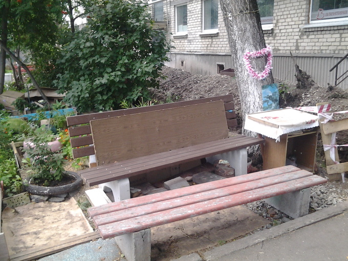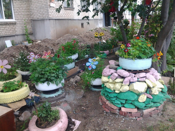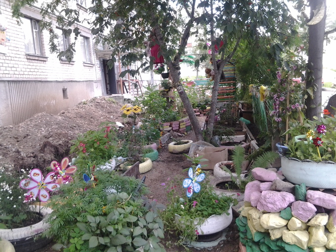 Прогуливаясь недавно по улице,я забрела в один дворик.И там я увидела такое......Местные жительницы,видимо садоводы,решили соорудить цветочный сад прямо под окнами.Так странно. Но все же они молодцы! Респект!