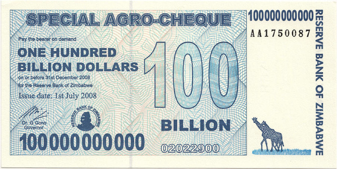 2. Период с марта 2007 по ноябрь 2008 года был весьма нелегким для Конго и тоже связан с гиперинфляцией. Ежедневный уровень инфляции в те дни достигал 98 процентов, а цены росли каждые 25 часов в 2 раза. Предшествовала этому состоянию земельная реформа 2001 года. Согласно которой земля была забрана у белокожих фермеров и отдана чернокожим. Это привело к серьезному падению производства. Позже правительство приняло еще ряд не совсем удачных социальных реформ, вызвавших массовое бегство жителей из страны. К тому же на территории государства разгорелась гражданская война, также вызвавшая дефицит государственных средств.