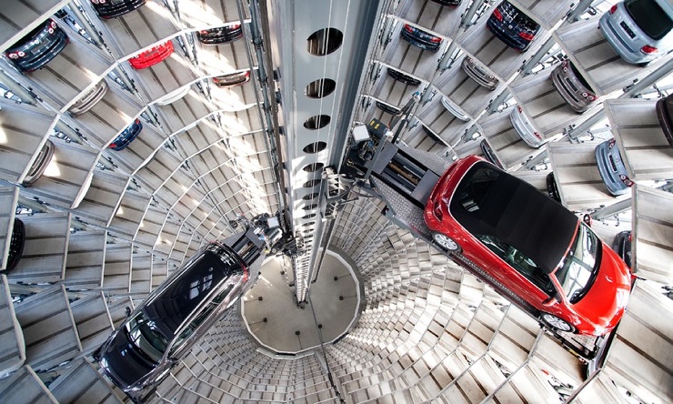 Автоматическая конвейерная система доставляет автомобили с завода в подвал башен.