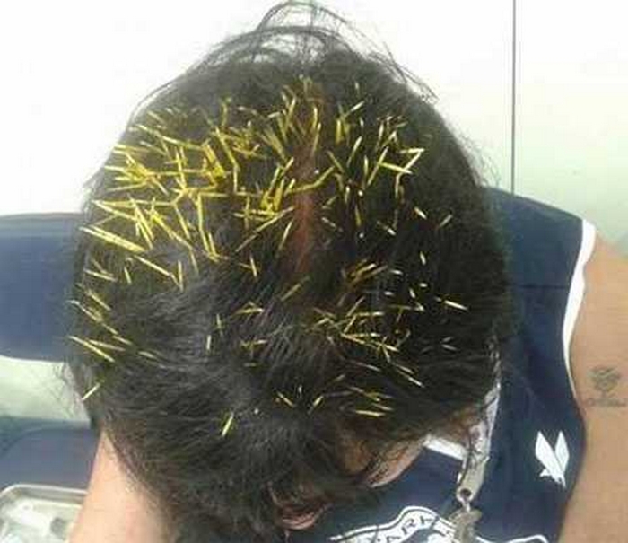 В больницу Бразилии в среду было доставлена женщина, голова которой превратилась в подушку для иголок. Причиной госпитализации стал упавший на голову несчастной дикобраз, оставивший в ее голове почти 200 своих игл...