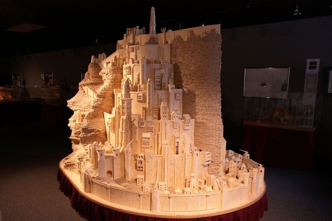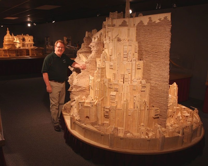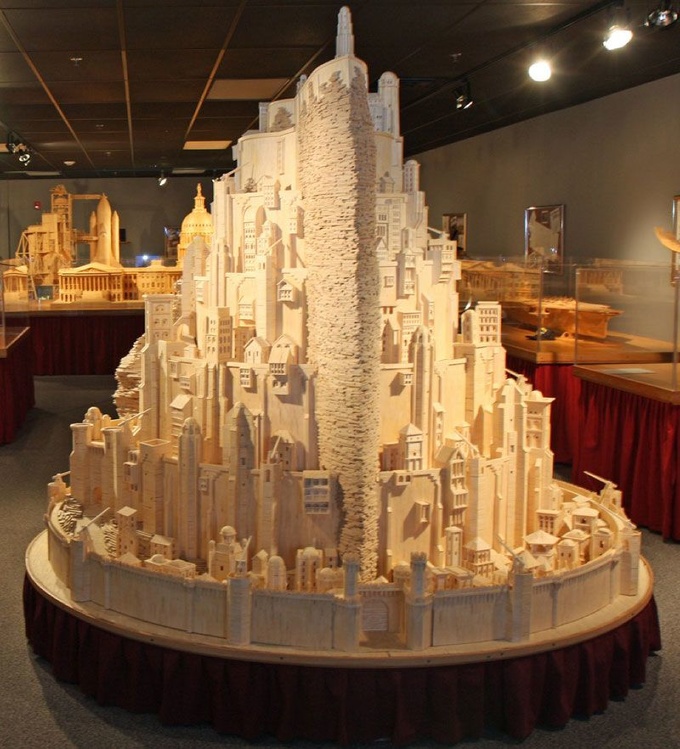 Американский художник Пэт Актон решил воссоздать сказочный город Минас Тирит (Город Королей) - столицу Гондора, из толкиновского Средиземья. На работу ушло три года и 420 000 спичек. И тонна клея, разумеется. Дополнительно 24 000 маленьких деревянных брусков ушло на строительство горы Миндоллуин, на скале которой построен город.