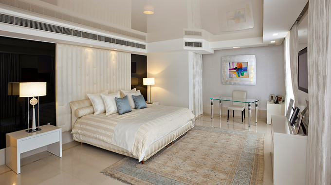 Гостиная напоминает огромный аквариум, светлый и сказочно уютный. На площади 250 кв. метров спроектированы две спальни и просторная гостиная зона, в отделке и декоре которых использованы исключительно качественные материалы, а помещения украшает дизайнерская мебель от Armani и Fendi Casa.