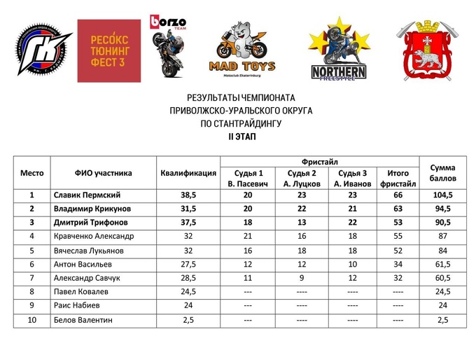 В соревнованиях выступали спортсмены из Екатеринбурга, Перми, Тюмени, Уфы, Миасса. Спортсмен из Миасса прибыл на соревнования своим ходом! После упорной мотоборьбы определились победители: кубок 2 этапа за 1 место достался спортсмену из г. Перми – Славику Пермскому, 2 место – Владимиру Крикунову из Тюмени. Райдеры екатеринбургской команды «MAD TOYS» Дмитрий Трифонов и Вячеслав Лукьянов заняли почетные 3 и 5 места соответственно из десяти возможных!