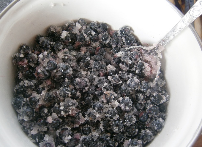 Откладываем его в сторону. Берем ягодки, промытые и очищенные, перемешиваем с сахором, добавляем капелюшку мускатного ореха.У нас получилась начинка для черничного пирога. Оставляем ее в покое и возвращаемся к тесту.