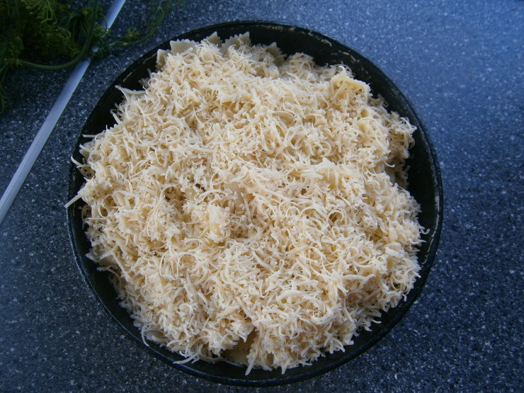 С порезаной половиной вот что сделала. Отварила макаронные изделия, лук довела до золотистого цвета, натерла сыр. На сковородку, смазанную маслом положила половину макарошек, затем рыбку, добавила немного маринованных помидорок, потом лучок, затем вторую половину макарошек и сверху сыр. Незабыла конечно все в процессе посолить. НЕмножко водички добавила и в духовку минут на 50.
