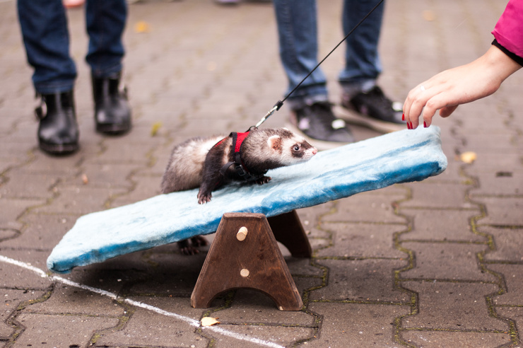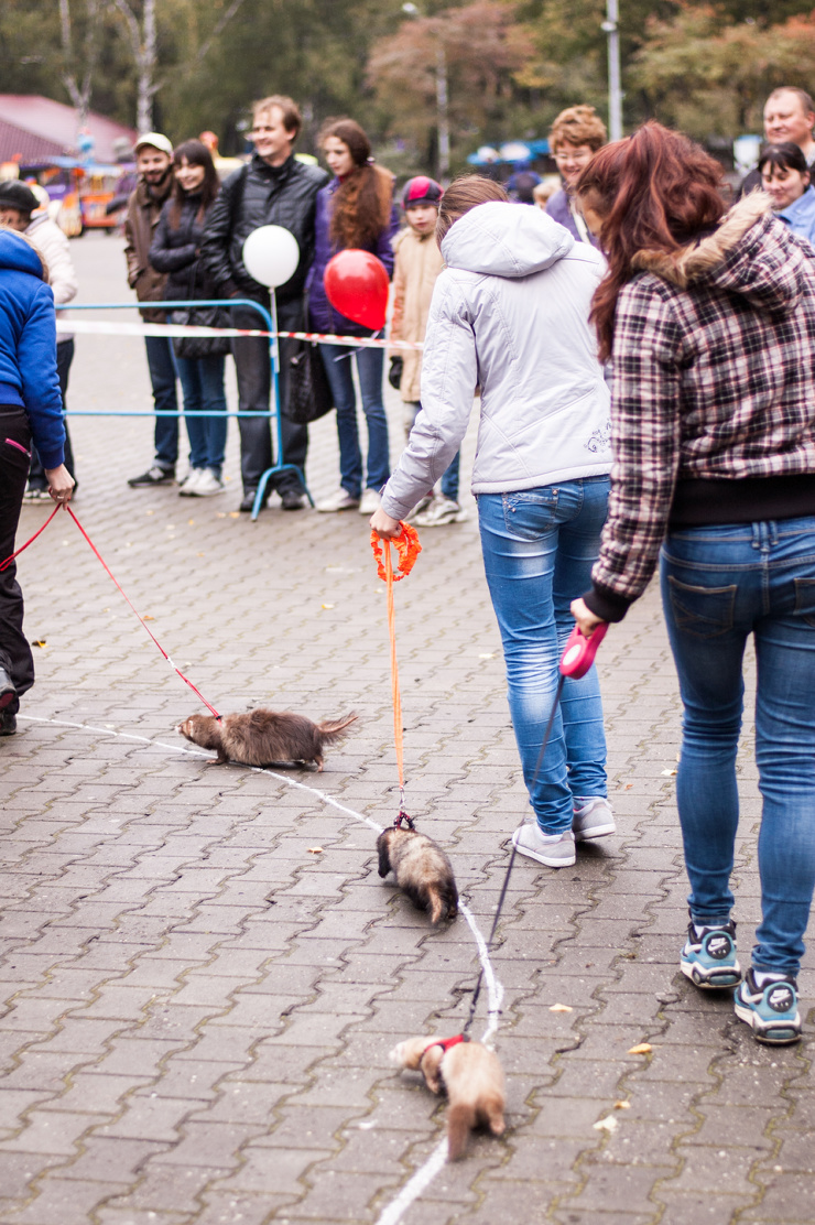 В начале состязаний хорькам дали возможность познакомиться друг с другом. Зверьки недоверчиво обнюхивали друг друга, после чего приступили к понятным только им игрищам.