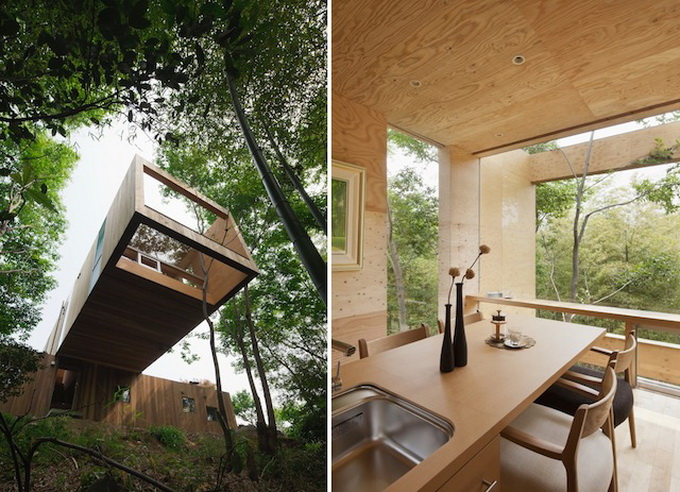 Вилла + Node была построена студией UID Architects, используя концепцию скворечника. Подвесное, древесное и минималистское, это здание имеет два этажа, расположенные перпендикулярно.