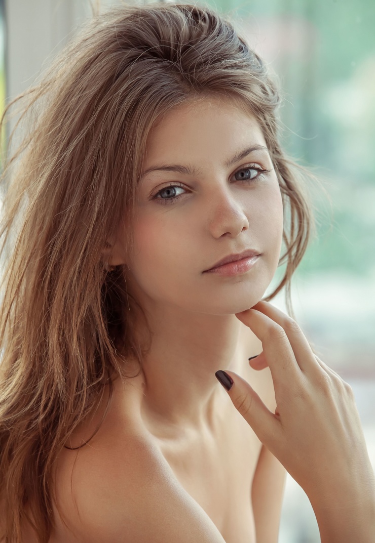 Симпатичная шатенка с голубыми глазами, с белым полотенцем вокруг пояса и в цветастых трусиках, представляет себя стоя у открытого окна и сидя на массивном кресле с бледно жёлтой обивкой