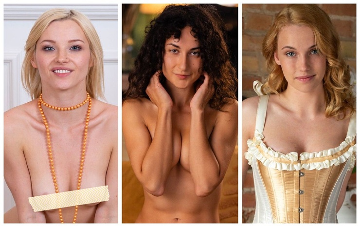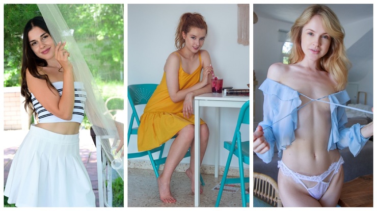 Горячая брюнетка с натуральными сиськами сняла красные колготки , развратная блондинка без нижнего белья разделась на улице а рыжая Девица с миниатюрными сиськами раздвигает ноги