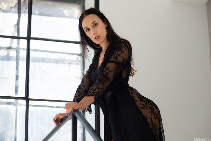 Эротично сняв со своего стройного сексуального тела шелковый наряд жгучая брюнетка с красивой упругой грудью оголиласвое свое тело на улице