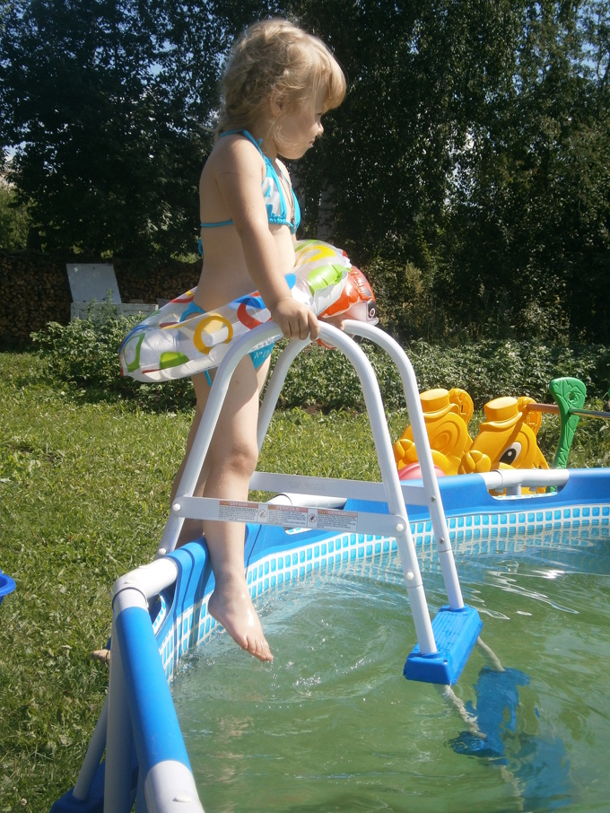 Для начала в срочном порядке мы приобрели бассейн. Собрали его и долго-долго ждали полного наполнения его водой, потом прогревали долго и упорно и наконец, свершился заплыв!!!
