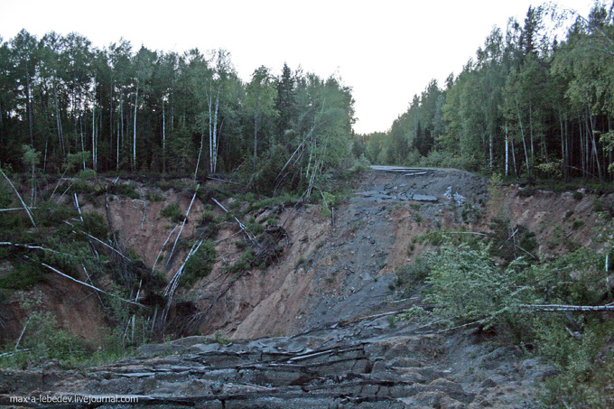 Ехал на днях из Екатеринбурга на север области. Есть там поворот с трассы Серов-Североуральск на Краснотурьинск. Раньше удобно было по этой дороге попутчиков подвозить, а потом ее закрыли. Тупо повесили кирпич, а для пущей убедительности вал земляной навалили поперек. По слухам - провалилась. Ну да, шахты в том районе есть, ну я поверил. Всякое бывает, осыпалась выработка, просела дорога.