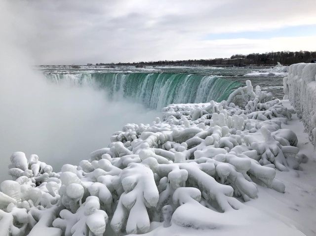 Туристы вовсю делятся фотографиями редкого природного явления - частично замершим Ниагарским водопадом...