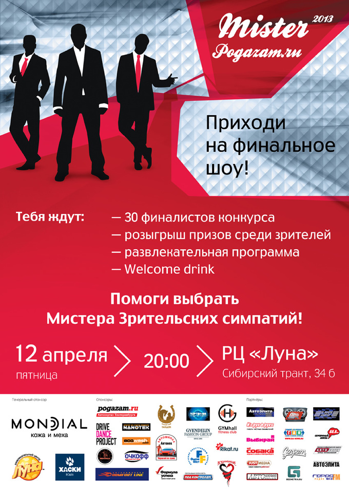 12 апреля в 20:00 в РЦ «Луна» состоится финал конкурса «Мистер Pogazam.ru 2013» — ежегодный проект для автолюбителей, в ходе которого выбирается лицо автомобильного мира города. Любой желающий может прийти в качестве зрителя и помочь выбрать победителя в номинации «Мистер Зрительских симпатий».