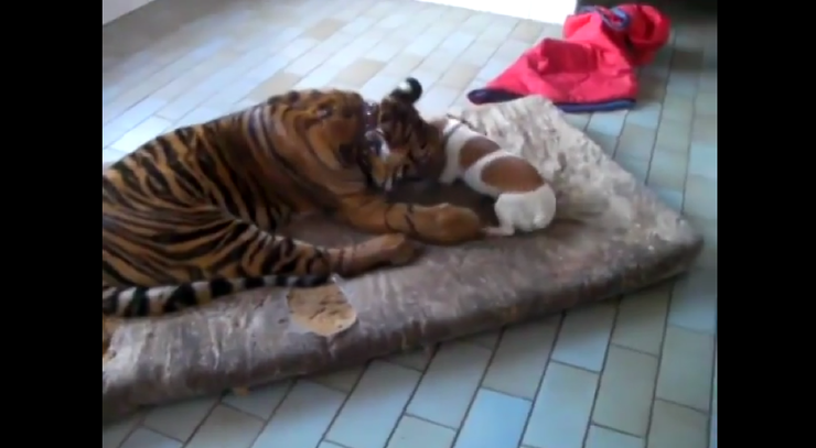 Котик явно почувствовал, что собачка устала и решил сделать ей массаж головы. Смешной и веселый ролик.