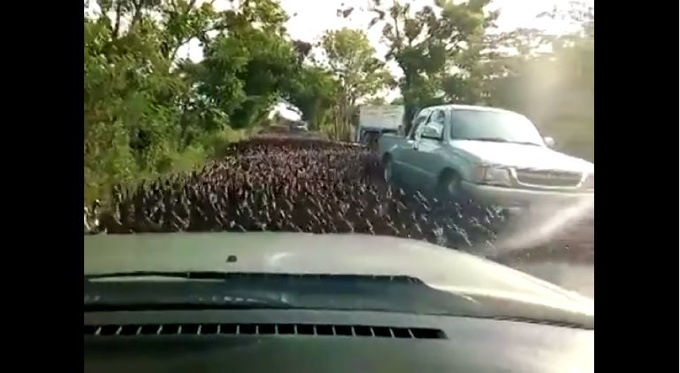 Видео снято видимо в Таиланде, судя по левостороннему движению. На проезжей части творится какой-то утиный зомби-апокалипсис. Птицы бегут сплошной волной, которая прерывается совсем ненадолго. Сдается мне, что они гоняют по кругу. Наверное, поймали какой-то клин.